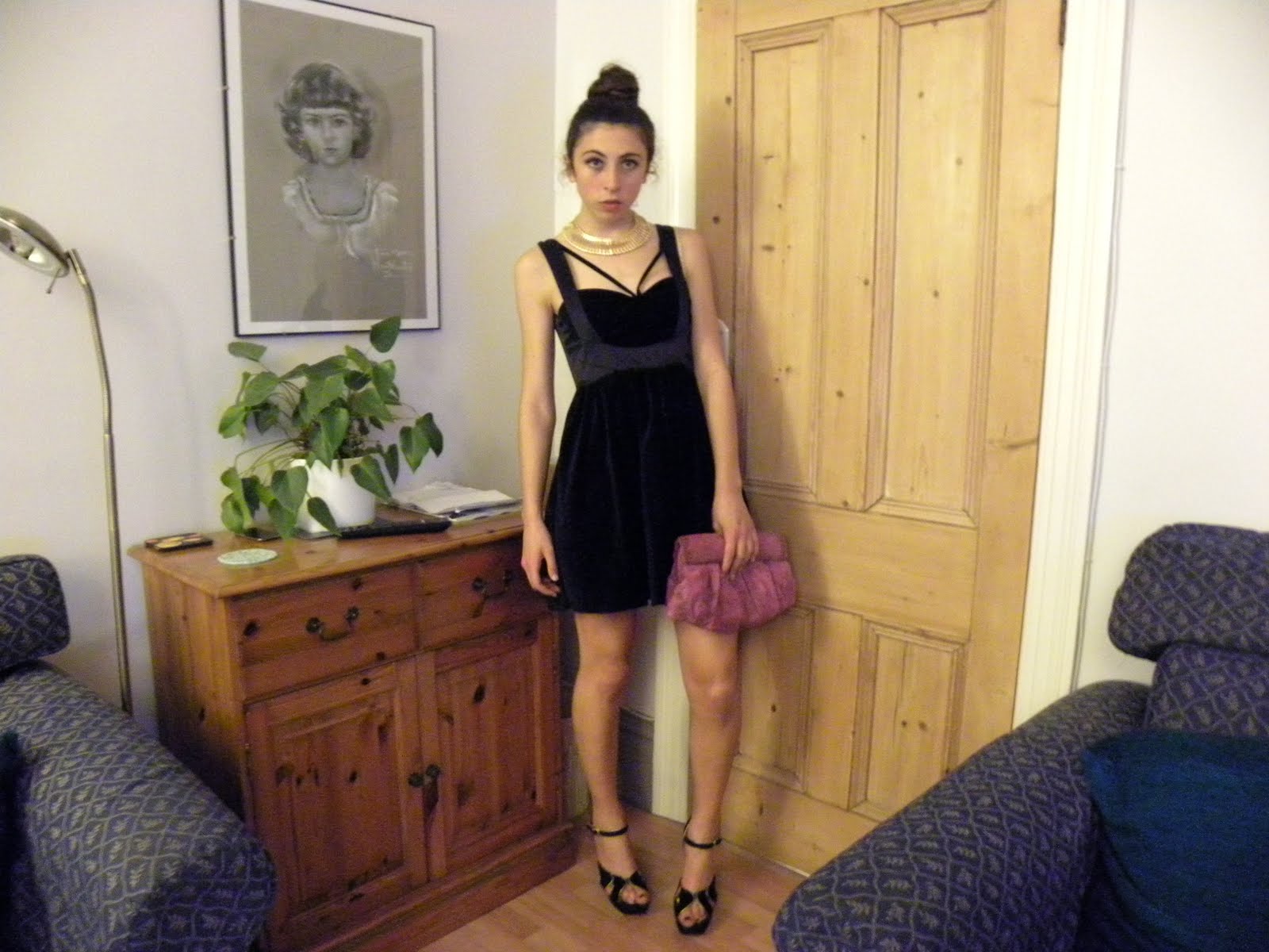 I went for dark and devious image , with my primark dress ( classy) , I was aslo wearing my gold and balck topshop heels and my topshop pink snakieskin clutch along with my gold collar necklace from HandM. I also went for some serious smokey eyes and a ballet bun.